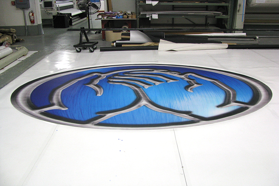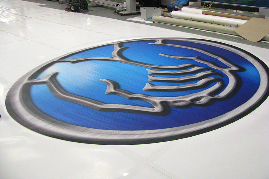 PrintOnCarpet produces branded flooring and can die-cut any logo or image into the surface. We produced the seamless 10 FT x 16 FT flooring, and die-cut the intricate Allstate logo design. The flooring worked great for the Allstate traveling exhibit, as it was made with lightweight material that could be easily be rolled up and taken on the road.