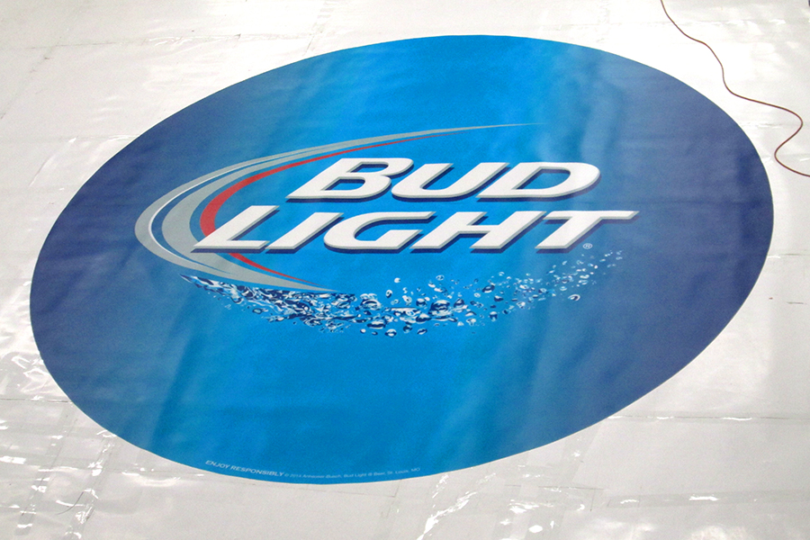 PrintOnCarpet manufactures Custom Clear Flooring, perfect for staging an event. Clear Printed Flooring is the most durable in the industry, is slip resistant, and can withstand travel wear and tear. The Bud light 14ft circular flooring was produced in two 7 x 7 panels, so it is lightweight and easily installed. The printed image was applied to the back of the clear material, so the design was protected from foot traffic and scuffing. Created using UV inks, the bright blue Clear Flooring finished piece is rich with color and eye-catching detail.